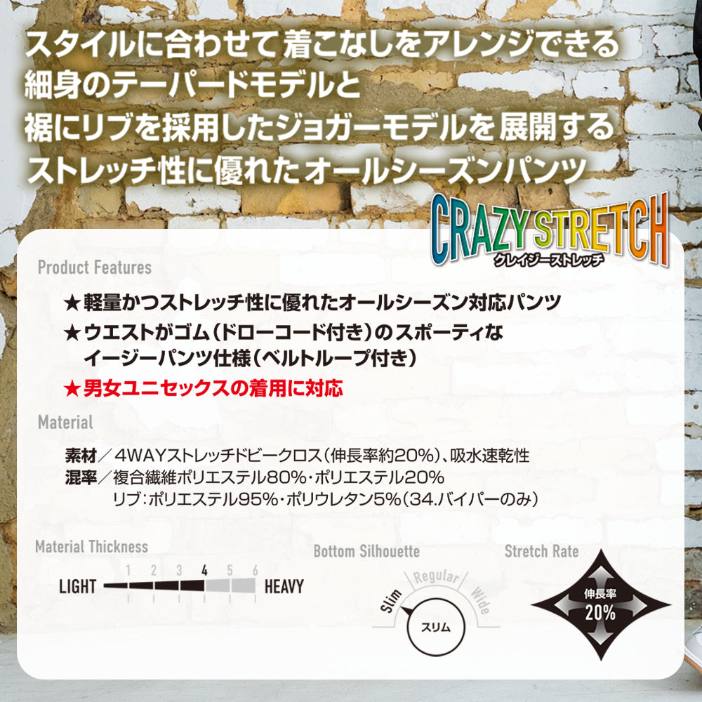 スタイルに合わせて着こなしをアレンジできる細身のテーパードモデルと、裾にリブを採用したジョガーモデルを展開するストレッチ性に優れたオールシーズンパンツ。