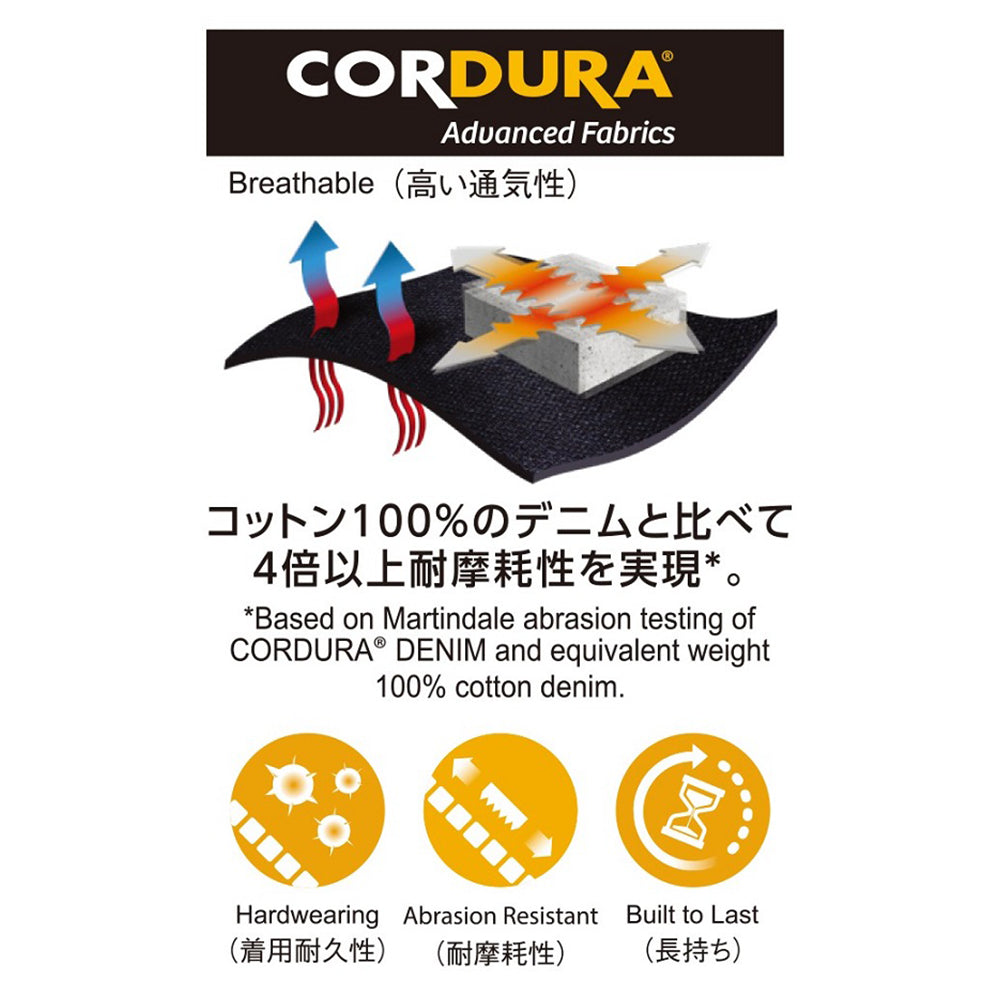 コットン100%のデニムと比べて4倍以上の耐摩耗性を実現するストレッチ性も兼ね備えたCORDURAデニム使用。