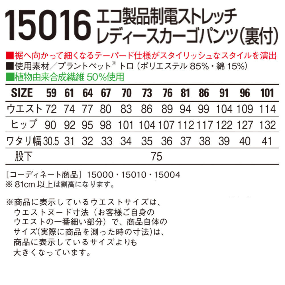 エコ製品制電ストレッチレディースカーゴパンツ(裏付) 15016