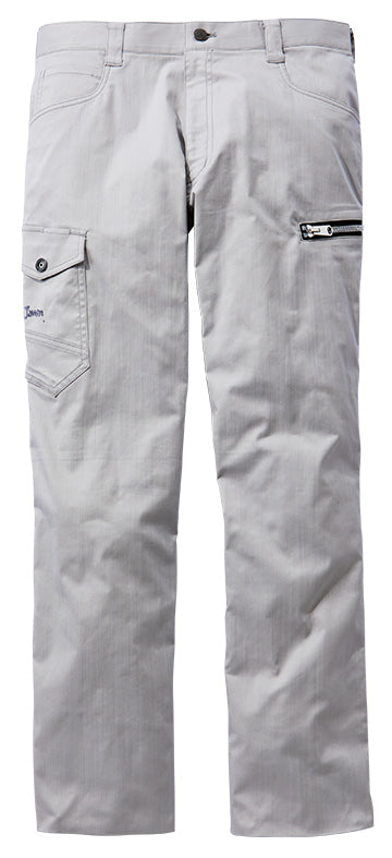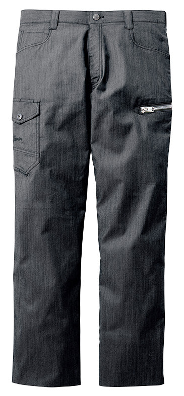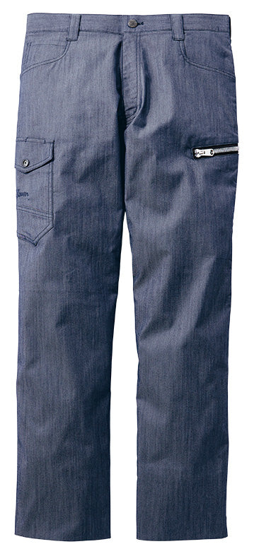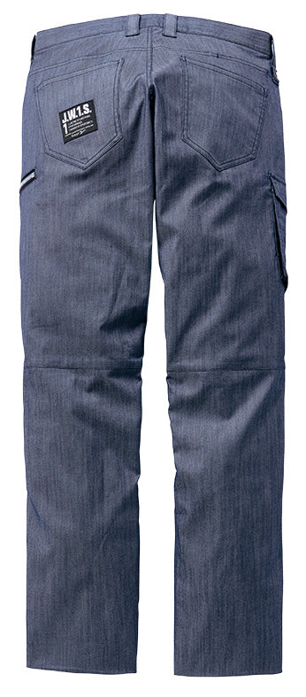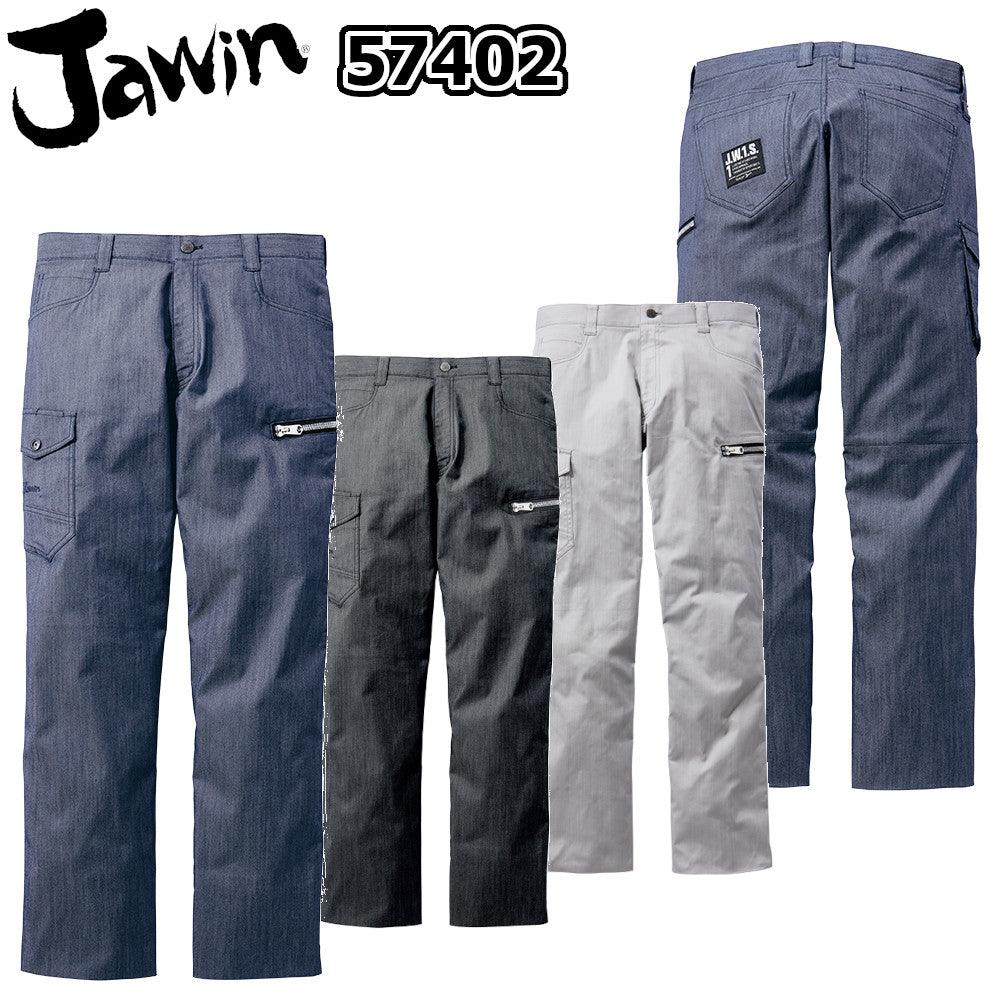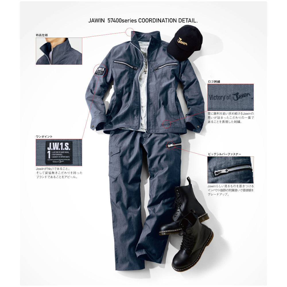 シルバーのビッグファスナーと衿髙デザインが魅力。デニム調のストレッチ素材を使用し、ライダースジャケットテイストのデザインに仕上げたJawinの新シリーズ。
