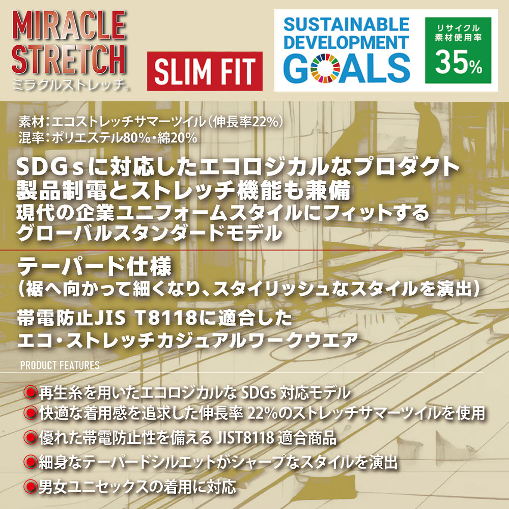 ※スリムフィット SDGsに対応したエコロジカルなプロダクト。製品制電とストレッチ機能も兼備